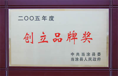 我公司由于2005年獲得了“安徽省名牌產品”和“安徽省著名商標”兩項榮譽,被縣委、縣政府評為“2005年度創立品牌獎”,兩項榮譽分別獲得現金10000元的獎勵!