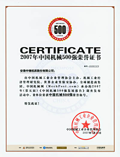2007年《中國機械500強》暨《世界機械500強》發展報告會7月20在北京人民大會堂隆重舉行,我公司榮獲“中國機械