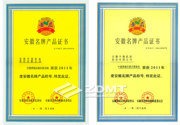 2012年3月22日,馬鞍山市召開了全市質(zhì)量技術(shù)監(jiān)督工作會(huì)議,會(huì)議對2011年獲得質(zhì)監(jiān)部門相關(guān)榮譽(yù)的企業(yè)與個(gè)人進(jìn)行了表彰,我公司中德牌液壓擺式剪板機(jī)和中德牌液壓板料折彎機(jī)兩個(gè)產(chǎn)品分別通過了2011年“安徽名牌”的復(fù)審。